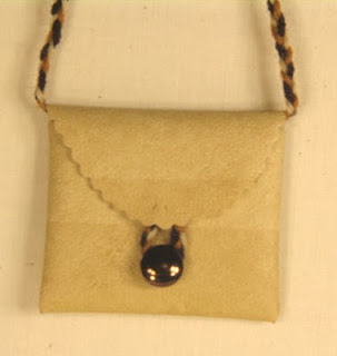 Vinyl wall covering makes a great purse material. It sort of looks like leather. This is a purse I made. I got an old wall covering sample book from the paint store for free. You can cut it easily and sew through it or use glue. This book had designs that are perfect for purses. I made the strap out of 3 kinds of yarn braided together. To close the purse, I sewed on a shiny copper-look button and made a braided yarn loop. On the flap I used my scallop scizzors. Many paint stores throw their old books out, so just ask for one and thank them profusely. Fun! Put a real penny in it for your doll!